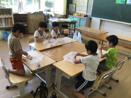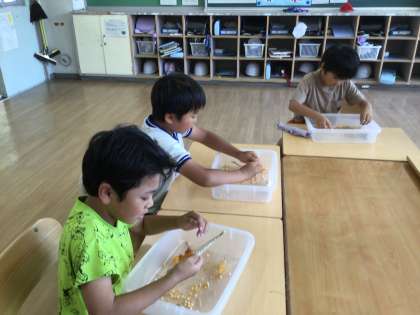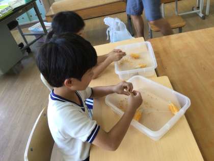 9月2日(火)2年生 今日の様子 公開日 2025/09/02 更新日 2025/09/02 お知らせ 畑で栽培していたはぜトウモロコシ(ポップコーン)を収穫してきました。実を芯から一粒ずつもぎ取っています。小さくて硬い実は、もいだときにあちこちに飛んでいきますが、一粒残らず拾い集めました。おいしいポップコーンができるといいですね。