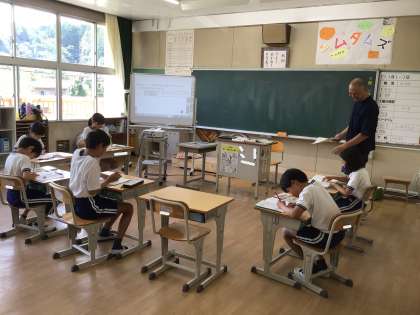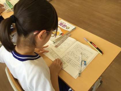 算数科の授業の様子です。「長方形の紙を6回折って広げたとすると、折り目の数は何本になりますか」という問題を解いています。実際に紙を折って数を数え、表にまとめていましたが、何回も折ると折り目が分からなくなったり、硬くなって「もうこれ以上折れない」という状態になってしまったりしました。しばらくすると、子どもたちの中から「これって、こうなってるんじゃない」と、つぶやきが聞こえ、表の中から規則性を見つけ出していました。