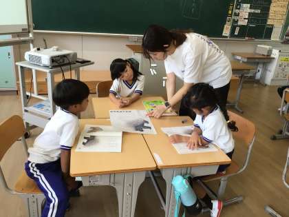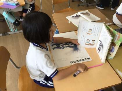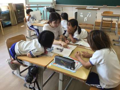 国語科「どうやってみをまもるのかな」の学習の様子です。グループごとに「やまあらし」「あるまじろ」「すかんく」を一つずつ担当し、身の守り方を本文から読み取っています。グループで相談しながら、「とげをたてて」「からだをまるめて」「しるをとばして」など、大切な言葉を本文から抜き出すことができました。