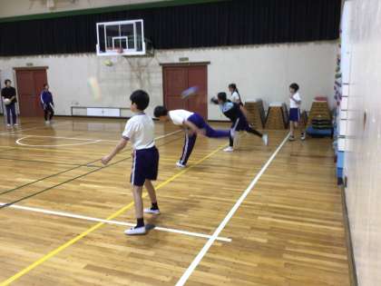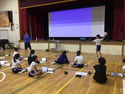 体育の授業の様子です。「公式ドッジボール」のルールを動画を視聴しながら学んだあと、ボールの投げ方を確認しました。「ボールを持つ腕はなるべく高く」「反対の腕を狙う方向へ伸ばす」「投げるときは後ろ足から前足へ全体重を移動させる」