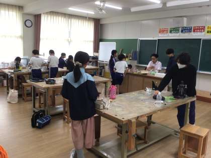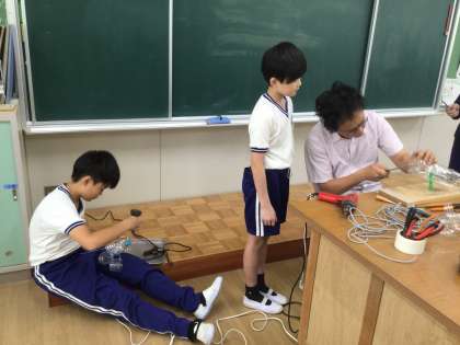 図画工作科の授業の様子です。ペットボトルと針金ハンガーを使って、風車を作っています。羽根の大きさや形、、角度などを試しながら作っていました。個々のオリジナリティーが光ります。
