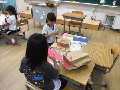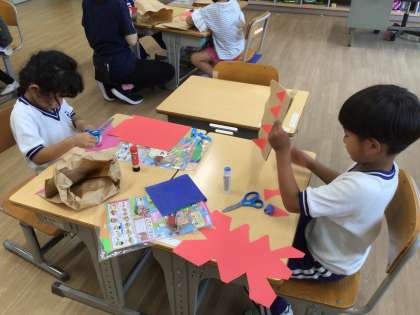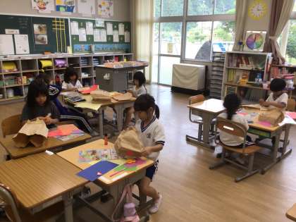9月5日(金)1年生 今日の様子 公開日 2025/09/05 更新日 2025/09/05 お知らせ 図画工作科「いっしょにあそぼう ぱくぱっくん」の授業の様子です。紙袋を使って、口が「ぱくぱく」する生き物を作っています。口の中に舌を貼り付けたり、耳やたてがみを付けたり、目で表情を出したりして、楽しみながら制作しました。