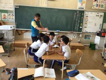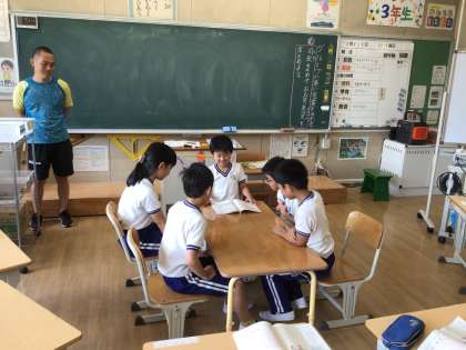 国語科「グループの合い言葉を決めよう」の授業の様子です。3年生では、話し合いの仕方の中で「司会」を学習します。今日は、司会者を決めて話し合いをする練習をしていました。初めてでスムーズには進みませんが、教科書の例に沿って、確認しながら進めていました。