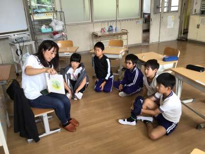 写真上:朝の読み聞かせの様子です。子守唄「ゆりかごのうた」の絵本では、ボランティアさんが実際に素敵な歌声で歌いながら読んでくださいました。(本当に素敵でした!)