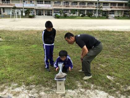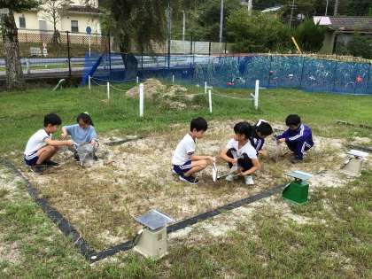 写真中・下:算数科で重さの学習をしています。今日は「1キログラム」を体感するため、はじめに1キログラムの重さを確かめた後、袋に砂を入れてどのペアが一番1キログラムに近い重さを作れるかを競っていました。