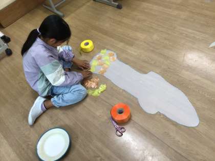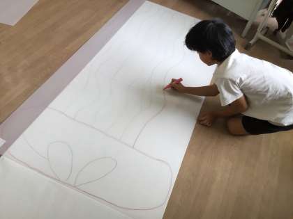 自分の好きな海の生き物をプラスチック段ボールに描いて切り取り、タフロープで飾り付けをしていきます。自分の体より大きかったり本物そっくりに描かれていたりして、あさひまつりで展示されるのが楽しみです。