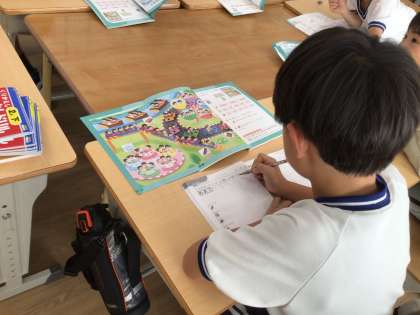 算数科の授業の様子です。教科書の絵を見ながら「同じ数ずつ何個のいくつ分」かを考えています。この考え方が、かけ算の学習につながっていきます。九九の学習が始まります。がんばりましょうね!