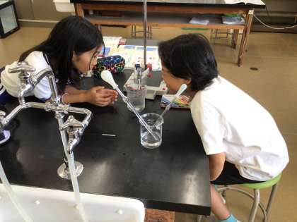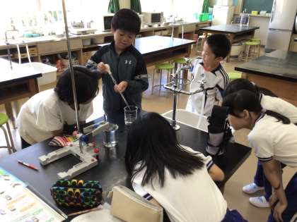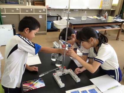 理科「ものの温度と体積」の学習で、水の温度が変わると、水の体積はどうなるのかを実験しています。試験管の口まで水を一杯に入れ、試験管を温めたり冷やしたりして、水面がどうなるかを観察しました。