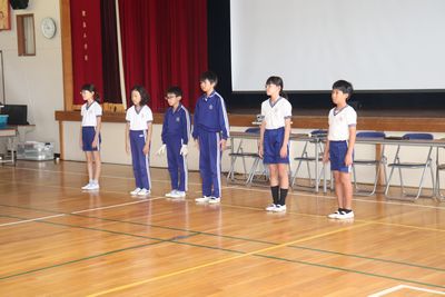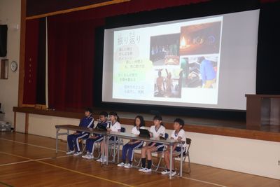 全校朝会で、5年生が林間学校での活動や思い出について発表しました。野外炊事やオリエンテーリング、キャンプファイヤーの映像に、1〜4年生は興味津、6年生は懐かしく見入っていました。
