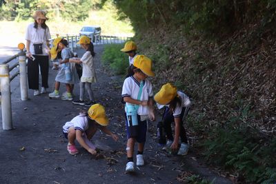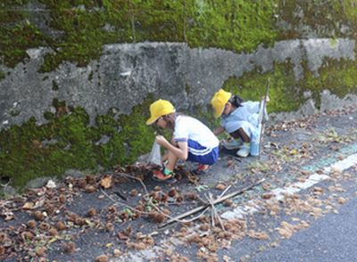 秋晴れの中、学校の周りの「秋見つけ」に出かけました。栗やドングリを袋いっぱいに拾い、学校に戻るとそれぞれの見つけた「秋」を見せてくれました。