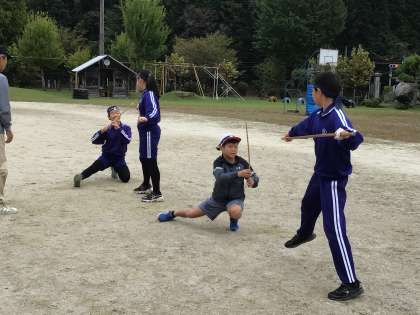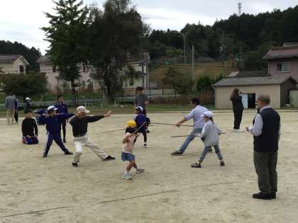 毎週火曜日の朝活動は棒の手練習です。地域講師の皆様のご指導の下、高学年の児童が下級生によい手本を見せ、丁寧に教えているので、低学年の児童もだんだん自信をもって演技することができるようになってきました。
