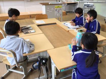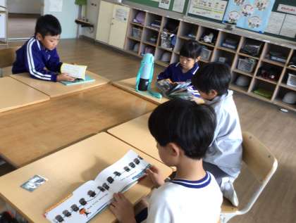 朝の読書タイムの様子です。夢空館でそれぞれ好きな本を借りて読書をしました。時折「見て、見て」と友達に声をかけ、お話の楽しさを共有していました。