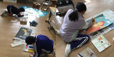 10月24日(金)4年生 今日の様子 公開日 2025/10/24 更新日 2025/10/24 お知らせ 写真:図画工作科の授業の様子です。読書感想画の仕上げに入っています。最後まで、丁寧に取り組んでいます。 写真中・下:「ねことねずみ」をしています。担任の「ね、ね、ね…」の後に続く言葉が「ねこ」か「ねずみ」かを聞いて、逃げたり追いかけたりします。みんな、逃げ足が速いようです。