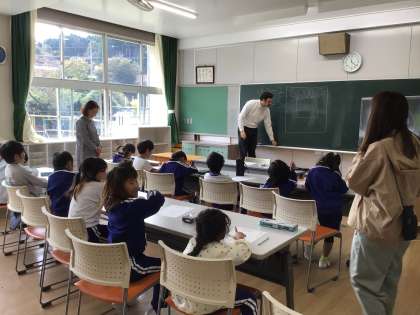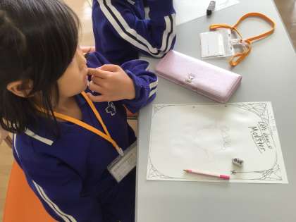 ALTとの外国語活動の様子です。ハロウィーンが近いこともあり、「Let's draw a Monster」として、モンスターを描きました。