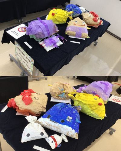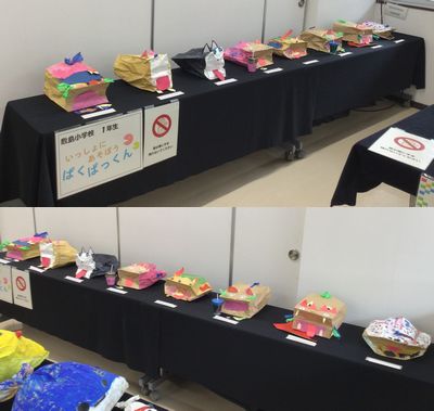 写真上:1年生「いっしょにあそぼう ぱくぱっくん」紙袋の形を生かして、口がぱくぱく動く生き物を作りました。