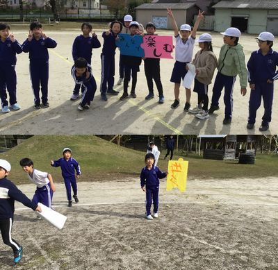 フリータイムに、「運動会マスター」から運動会のスローガンを見つけ出すよう各学年にミッションが出されました。校内に隠されている、パズルのピースを見つけ、つなぎ合わせること。どの学年もみんなで協力してピースを見つけ出し、運動場でつなぎ合わせてみました。