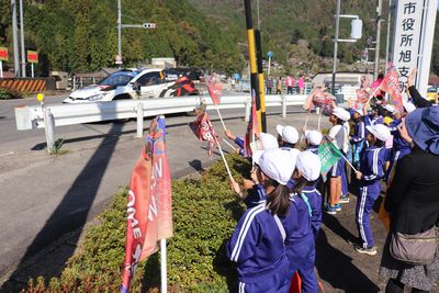 待望の1台目が通過すると、大きな歓声が上がり、大きく旗を振って応援しました。