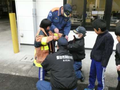 11月25日(火)3年生 今日の様子1 公開日 2025/11/25 更新日 2025/11/25 お知らせ 社会科「火事からくらしを守る」の学習で、消防署(旭出張所)の見学に行きました。 お話を聞いたり質問に答えていただいたりするだけでなく、実際に防火服を着て放水の体験をさせていただきました。 出動時には、これだけの装備を3分でするのですから、とても大変です。