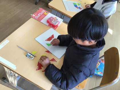 12月1日(月)1年生 今日の様子 公開日 2025/12/01 更新日 2025/12/01 お知らせ 算数科「かたちづくり」での授業の様子です。三角形の色板の並べ方を考えて、示された形を作ったり個々に思いついたものを作ったりしました。 アイディアがどんどん浮かんでくるようで、楽しそうに作っていました。