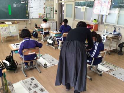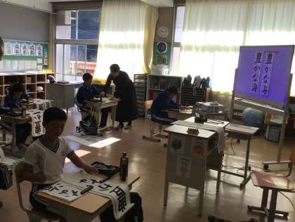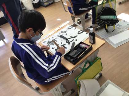 12月2日(火)5年生 今日の様子 公開日 2025/12/02 更新日 2025/12/02 お知らせ 講師による書き初め指導の様子です。 一人ずつ、声をかけていただきながら、丁寧に書いてました。5年生はみんな「かな」がとても上手です。