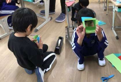 カッターナイフの扱いにも慣れ、思い思いの窓を作って楽しんでいました。