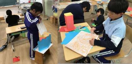 図画工作科「まどをあけたら」の製作の様子です。カッターナイフを使って窓が開くように切り、窓の中に見えるものを工夫して作ります。