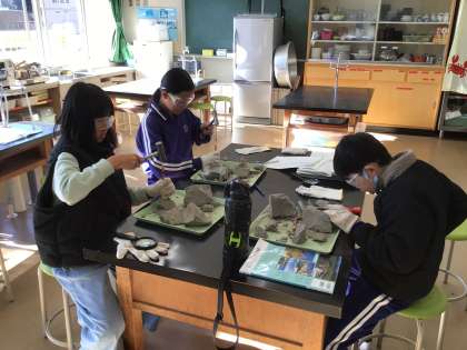 12月9日(火)6年生 今日の様子 公開日 2025/12/09 更新日 2025/12/09 お知らせ 理科「土地の作りと変化」の学習で、今日も講師の方をお招きし、化石発掘体験を行いました。田籾町岩石をお持ちいただき、化石を発掘することで、1800万年前の田籾町の環境を考察しました。 子どもたちが鑿とハンマーを使って掘っていくと、貝殻の化石がいくつも見つかり、その辺りは海だったことが分かりました。 とても貴重な体験をさせていただきました。ありがとうございました。