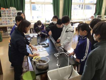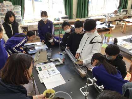 12月11日(木)6年生 今日の様子 公開日 2025/12/11 更新日 2025/12/11 お知らせ 理科「地層のでき方」の授業の様子です。川の流れに見立てた実験装置に実験用に色を付けた砂を流し、堆積する様子を観察しています。子どもたちの予想は「粒の大きいものから(下に)沈む」「重いものから沈む」でした。どんな結果になるでしょうか・・。水が澄んでくるまで時間がかかるので、じっと見守っていました。