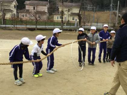 綱引きの綱に通したフラフープを、綱だけを持って送っていくというゲームで、運動会の時の赤白2チームに分かれて対戦しました。