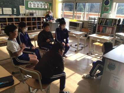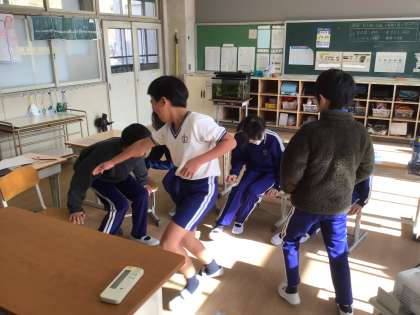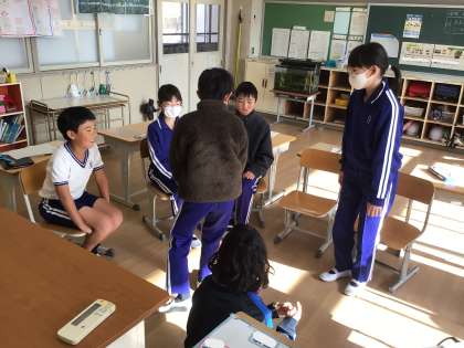 12月23日(火)5年生 今日の様子 公開日 2025/12/23 更新日 2025/12/23 お知らせ こちらもやるべき課題を終えた5年生。「フルーツバスケットを楽しんでいます。「今日70回笑った人」「…70回は笑ってないなあ」、「今日、海を見た人」「海は…見てないよ」みんなお題が凝っていて、なかなか該当者がいません。 「地球が回っていると思う人」これは、全員がそう思っていたようです。