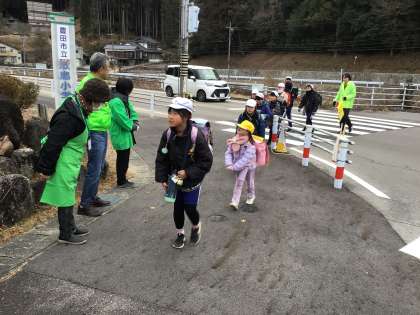 写真中:民生児童委員の皆様が交差点に立ち、子どもたちにあいさつをしてくださいました。子どもたちも元気にあいさつをすることができ、寒い朝でしたがぽっと心が温まりました。