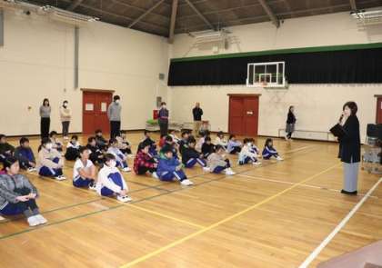 写真下:「冬休み明け集会」を行いました。校長からは「今年は午年。馬のように目標に向かって元気に走り出す力があふれる年です。新しいことにチャレンジしたり友達と力を合わせたりしてぐんぐん成長できる一年にしましょう」と話しました。