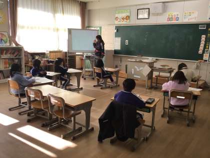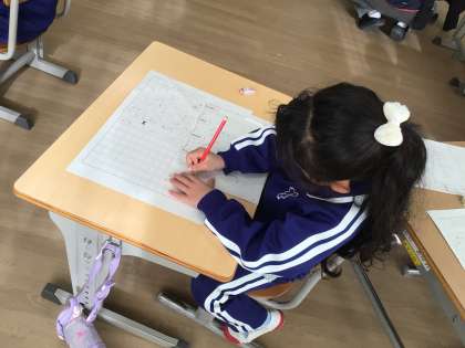 国語科の授業の様子です。原稿用紙での作文の書き方を学習しています。「書き始めは一ます空ける」「会話文は改行して「」をつける」など、習ったことを一つずつ確認しながら、冬休みの思い出の作文を書いていきました。
