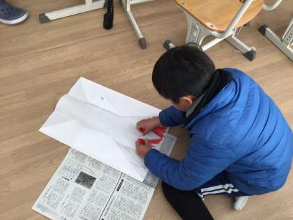 生活科「おもちゃづくり」の様子です。新年らしく、凧づくりに挑戦です。凧に描く絵柄をいろいろ考えている子、図柄を参考にしようと学数用タブレットで検索している子など様々でしたが、アイデアがまとまると、迷いなく描き始める姿が見られました。
