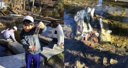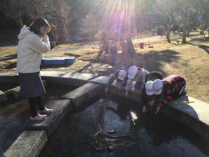 1月9日(金)4年生 今日の様子 公開日 2026/01/09 更新日 2026/01/09 お知らせ 理科「冬の生物のようす」の学習で、丸池の水の温度を測っています。朝の気温はマイナス5度だったので、丸池はすっかり凍っていました。 氷が張るくらいなので、池の水の温度もマイナスになっていると予想した児童もいたようですが、氷を割って測ってみると、氷の下の水温は1度。「水は0度になると凍っちゃうから、凍ってない水は0度より高いんだね」と納得していました。