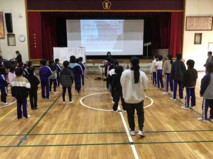 講師の先生をお招きして「この星に生まれて」合唱指導をしていただきました。発声練習から始め、「おなかに力を入れる」「口の奥を広く」など、よい声が出るこつや歌唱のポイントを教えていただくと、少しずつ声が出るようになってきました。しっかり声が出ると、子どもたちも自分たちの歌声に自信をもって歌うことができるようになりました。