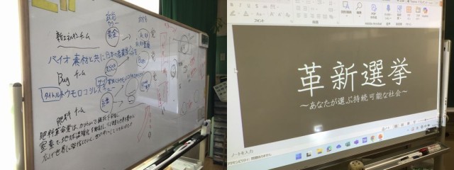 これまで「持続可能な社会」について、それぞれのテーマで調べてきたこと、それを踏まえた考えを基にした主張で「政党」を作り、選挙を行うことにしました。それぞれの「政党」ののぼりのデザインを考えているところだとのこと。