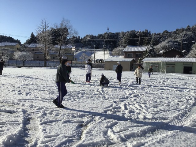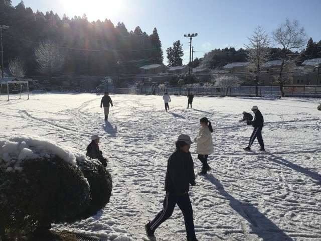 雪で朝活動のなわとびはお休みです。「雪が溶けないうちに」といち早く運動場に出てきたのは、6年生です。担任が雪玉の標的になっています。