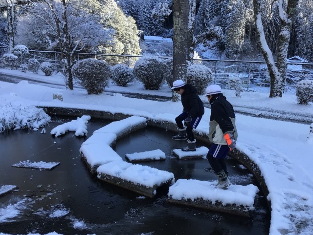 丸池にも氷が張っています。できるだけ大きな氷を取り出すことに挑戦していました。