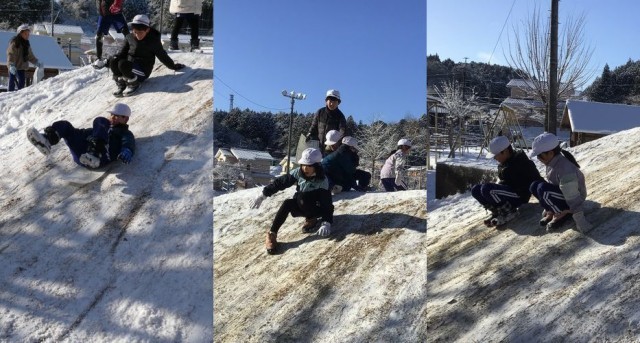 築山は滑り降りるのにちょうどよく、みんなが集まってきました。ラミネートしたプリントをそり代わりにして勢いよく滑っていました。