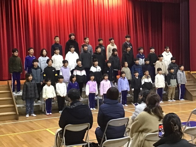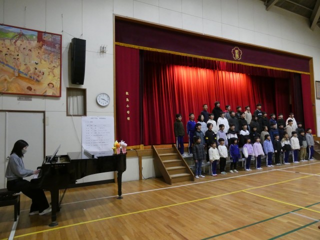 オープニングは全校合唱「この星に生まれて」です。今日は、みんな一段とよく声が出ていました。
