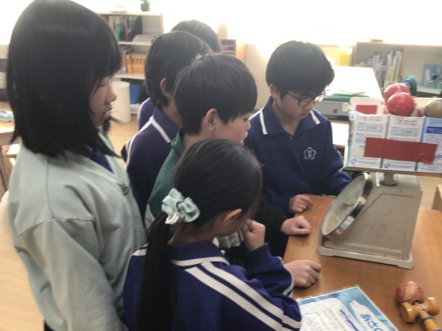 理科「ものの重さ」の授業の様子です。けん玉が入った牛乳パックの箱と、中身が入っている金属製の水筒を手に持ち、体感でどちらが重いかを比べています。物質として「金属」である水筒の方が、一見重そうに見えますが、実際に量ってみると、けん玉入り牛乳パックの方が重くなっていました。この後も違う物質同士で重さを比べ、「物質によって重さが異なるので、同じ体積で比べないといけない」と学びました。