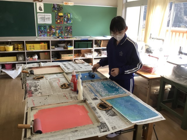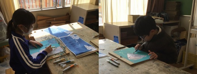 図画工作科「ほり進めて 刷り重ねて」で木版画の多色刷りに挑戦しています。「彫って刷り、また彫って今度は違う色で刷る」を繰り返していきます。子どもたちが選んだテーマは「生き物」。海の生き物や昆虫、樹木などさまざまです。混色やグラデーション、刷り重ねる色の組み合わせなども工夫しています。完成した作品を見るのがとても楽しみです。