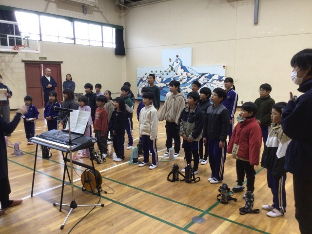 5年生がしっかりと全体の歌声を支えます。卒業する6年生に、心のこもった歌が贈れるように練習していきます。