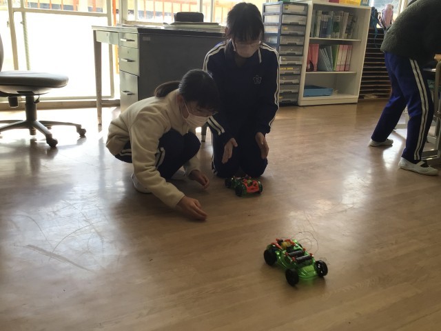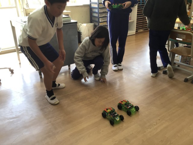 理科「電磁石の性質」で電磁石を利用した車を作っています。試しに走らせてみて、「後ろ向きにはしってしまう」「ちょっと遅いな」などと気になる点の原因を考え、「電池の向きを変えたらどうかな」「スイッチの接触が悪いかもしれない」などと相談しながら取り組んでいました。