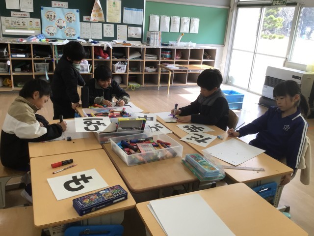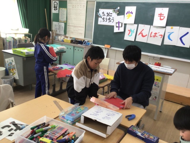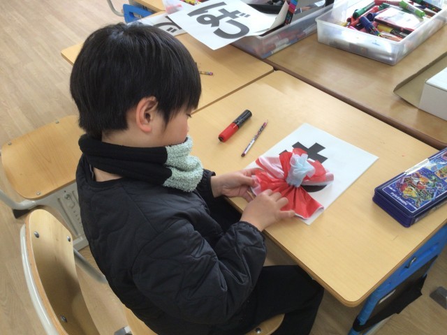 6年生を送る会に向けての準備を進めています。お世話になった6年生に、心をこめて「中学校でもがんばってください」のメッセージに色をぬったりお花紙で作った花を付けたりしました。