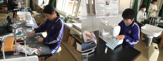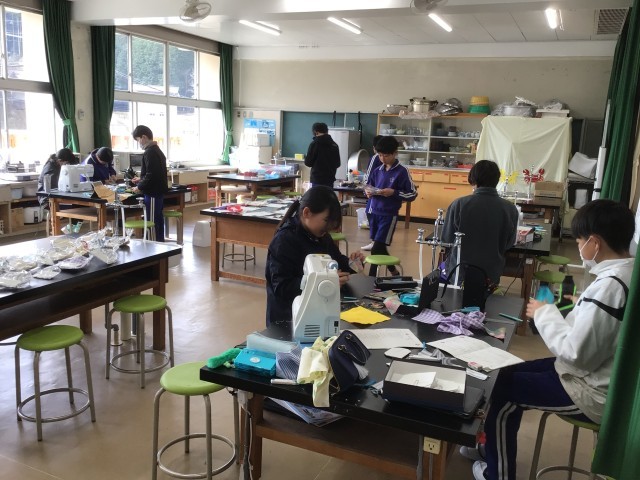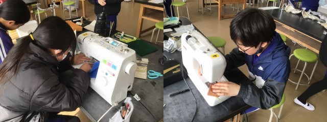 家庭科「感謝の気持ちを伝えよう」で、お世話になった方へのプレゼントを作っています。ミシン縫いやボタン付けなど、習ったことを駆使してみんなそれぞれ集中しててきぱきと作業を進め、家庭科室はさながら小さな工場のようでした。