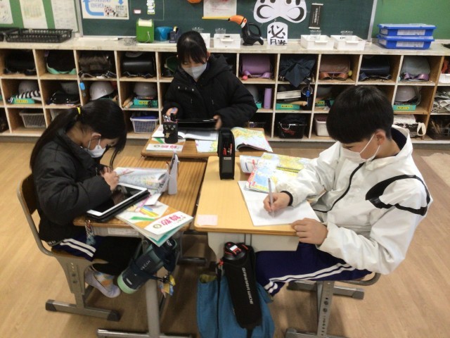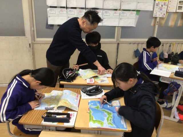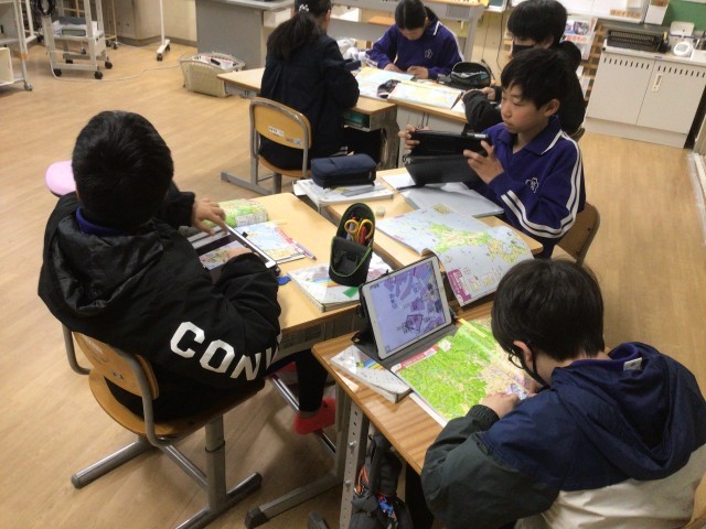算数科「およその形と大きさ」の授業の様子です。都道府県や島の面積を、およそどのような形と見れば、面積をを求められるかを考えています。面積を求めるには、既習の公式が使える形にすることが必要です。「これ、台形でいいかな」「平行四辺形っぽいかな」などと言いながら、地図に線を引いたり長さを測ったりしていました。計算した面積が、実際の面積とどのくらい近いか、楽しみですね。