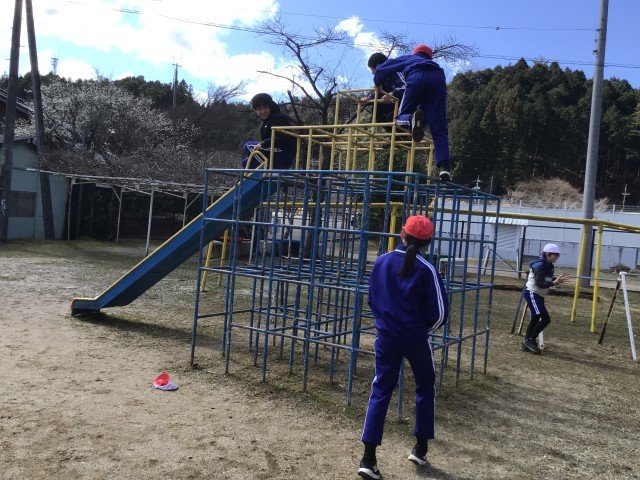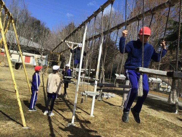 体育科の授業の様子です。校庭の遊具をアトラクションに見立て、どのような遊び方をすると安全に楽しくできるか、グループごとに考えています。考えるのも楽しそうです。