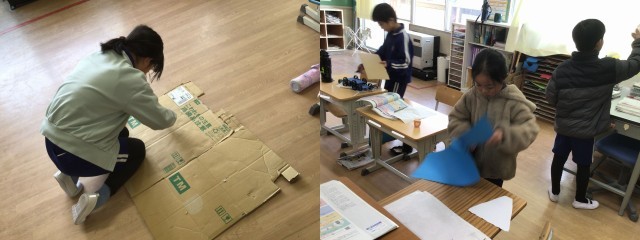 理科「おもちゃショーを開こう」の授業の様子です。理科で学習してきた「ゴム」「音」「電気」「磁石」などの性質を生かして、おもちゃを作ります。どんなものが作れそうか、互いにアイディアを出し合い、作りたいものが決まったら、制作開始です。どんなおもちゃができるのか、楽しみにしています。